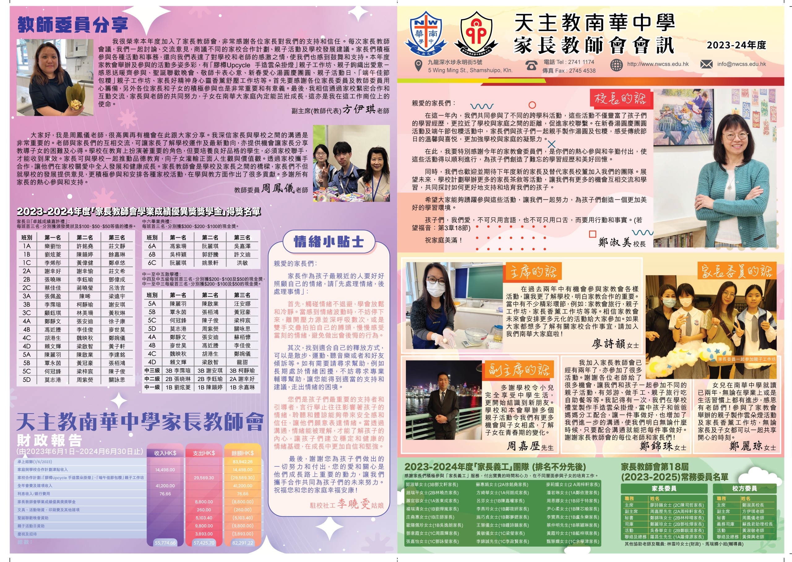 家長教師會副主席郭淑華女士 今年有幸參加家教會,了解到許多學校溝通及親子教育的知識,參加了不同的家教會活動,例如家長教師會學業成績優異獎學金,學生午膳,家長教師會選舉,多元化的親子活動等。再次感謝鄭校長及老師們為學校盡心盡力的付出。