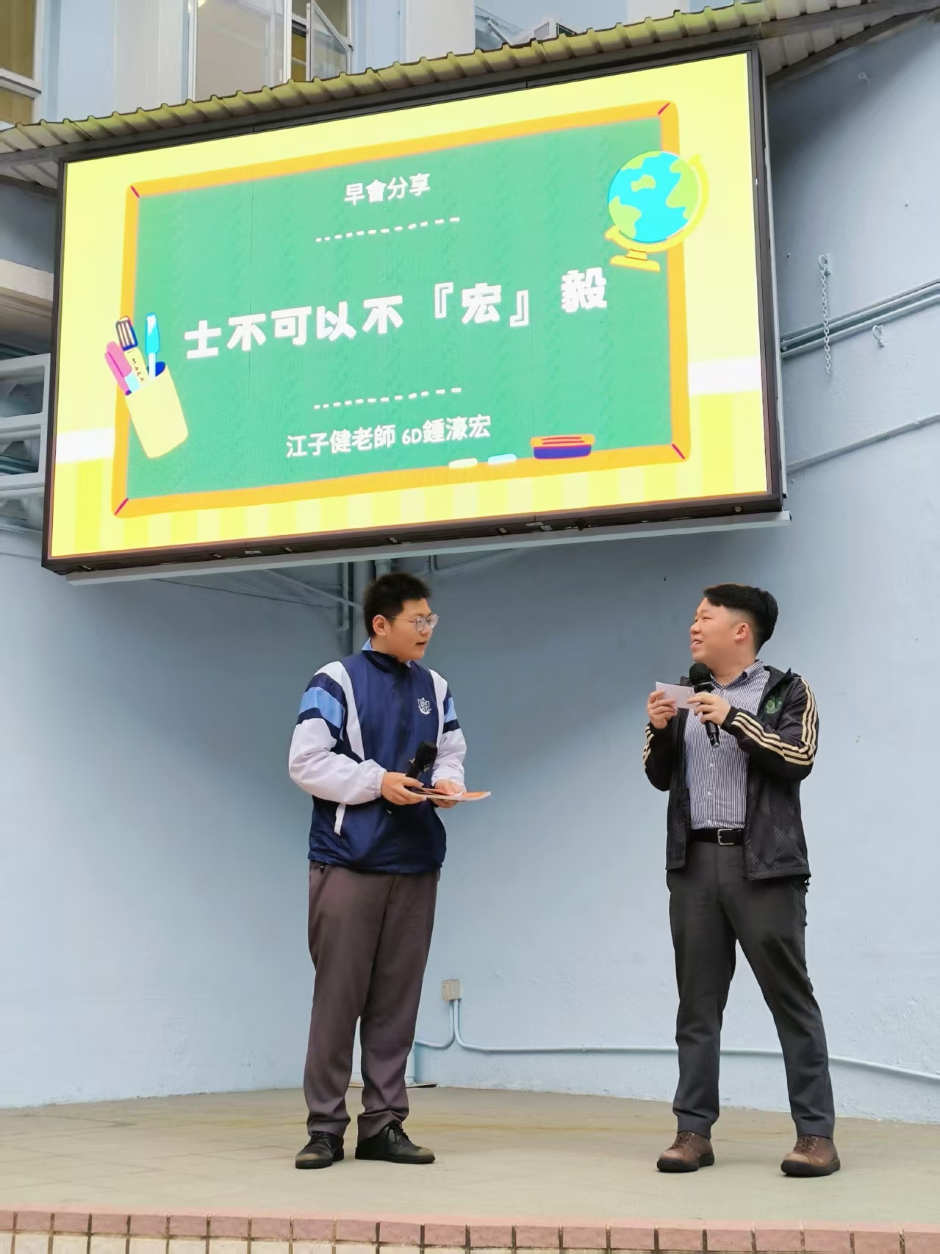 以少年之聲,傳弘毅之風,踐卓越之行。中文科江子健老師攜同6D班鍾濠宏同學,帶來「士不可以不『宏』毅」主題的早會分享。